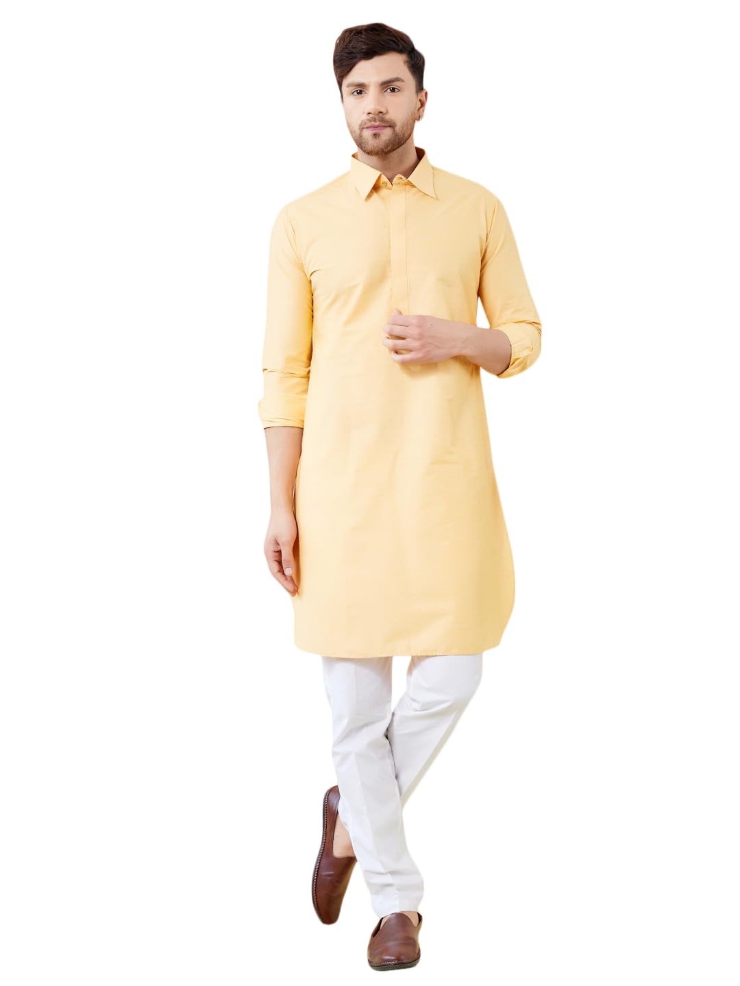See Designs Men Yellow Cotton Solid Spread Collar Curved Hem Side Slit Full Sleeve Pathani Kurta with Pyjama - BNRSKT62201M