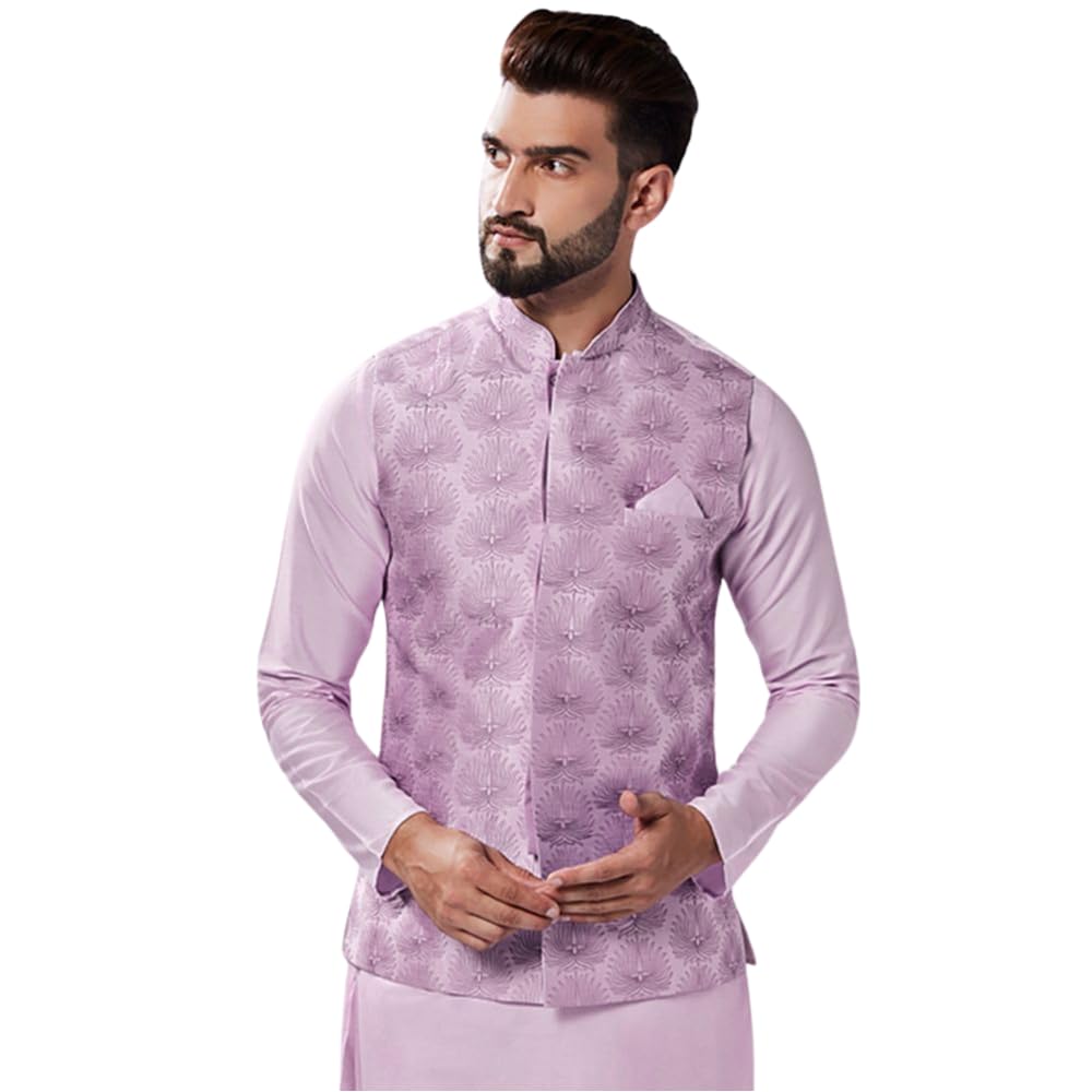 KISAH Men's Nehru Jacket, Lavender Silk Blend, Embellished Sleeveless Regular Fit Mandarin Collar (XL)