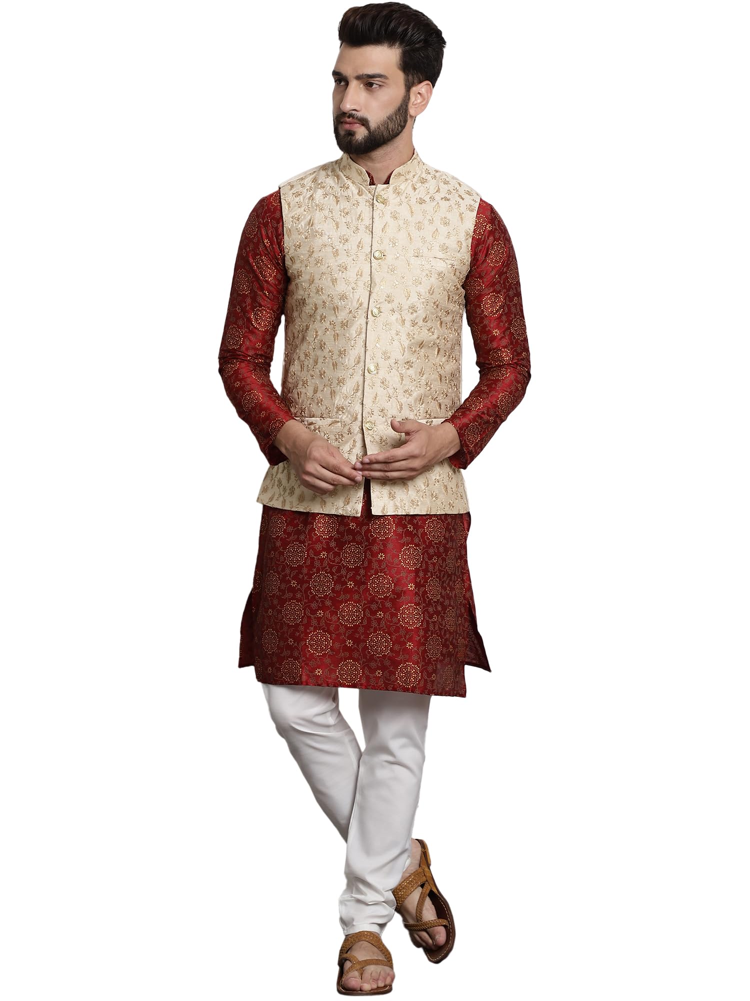 SOJANYA (Since 1958 Men's Silk Blend Maroon Kurta & Cream Pyjama With Beige Embroiderd Nehrujacket