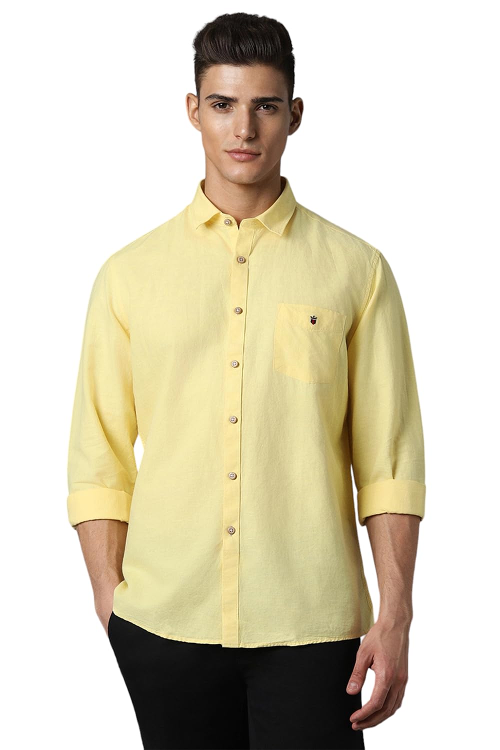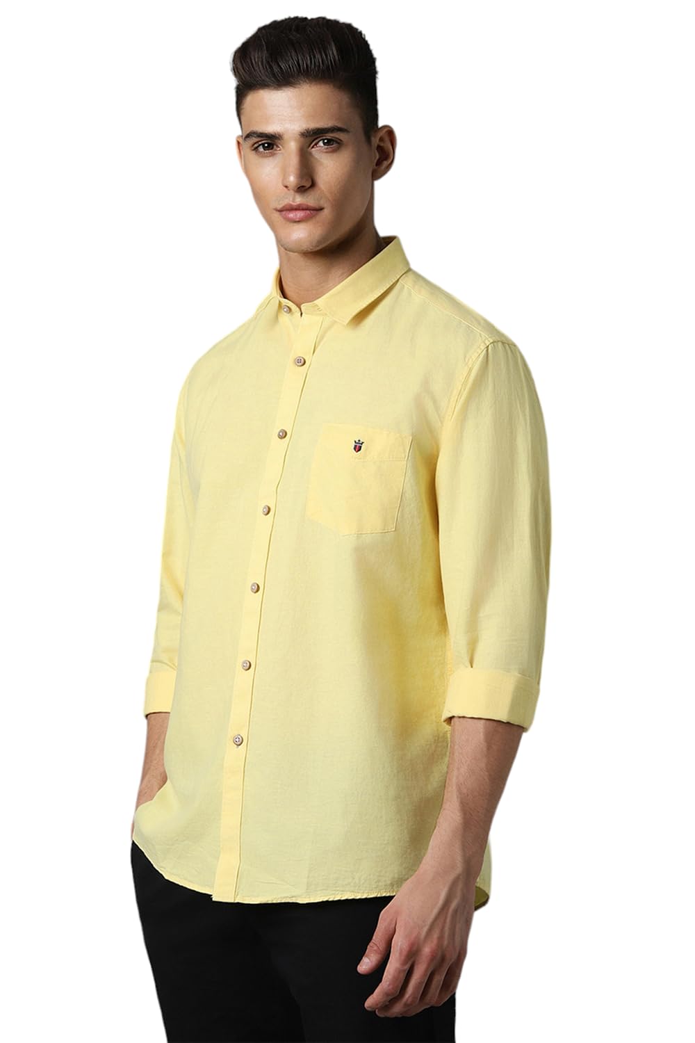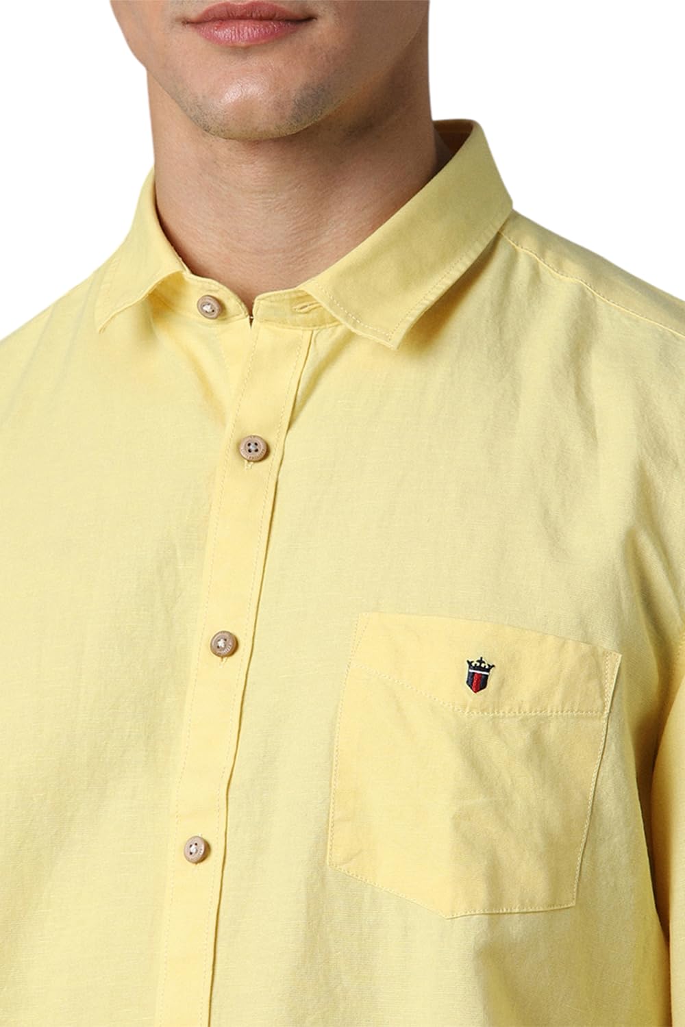 Showcase your refined sartorial taste in this Yellow Solid shirt from Louis Philippe Sport at a Casual event. Tailored in Slim Fit , this shirt features a Regular Collar , Full Sleeves , and is crafted from exquisite 67% Cotton and 33% Linen .
