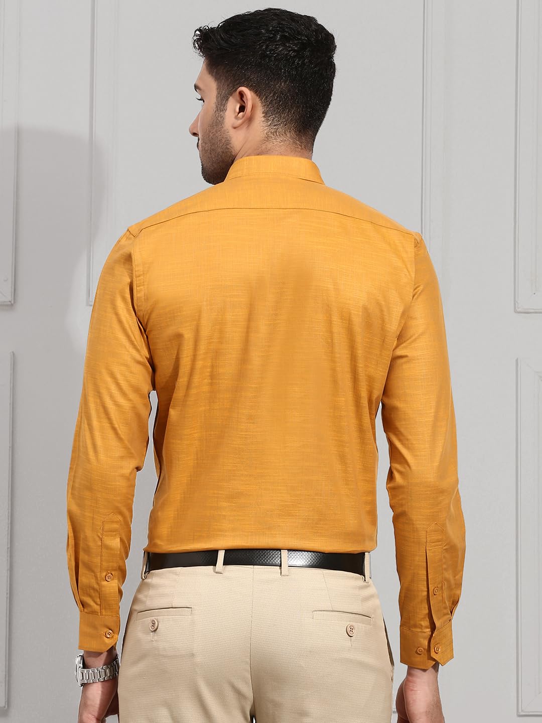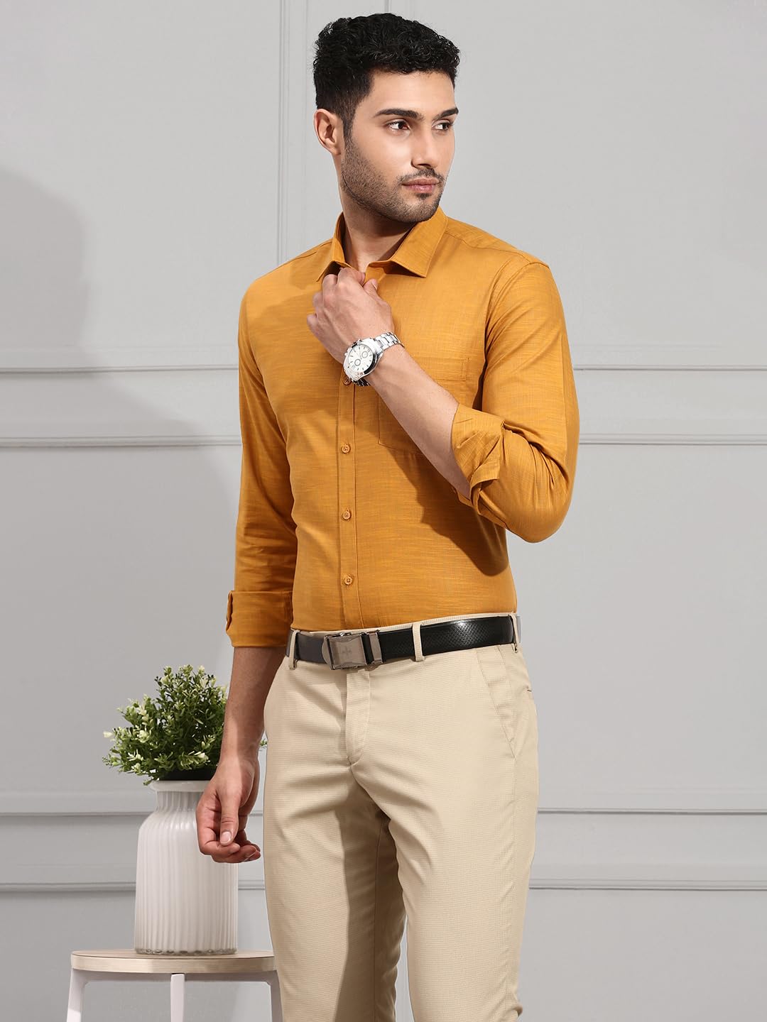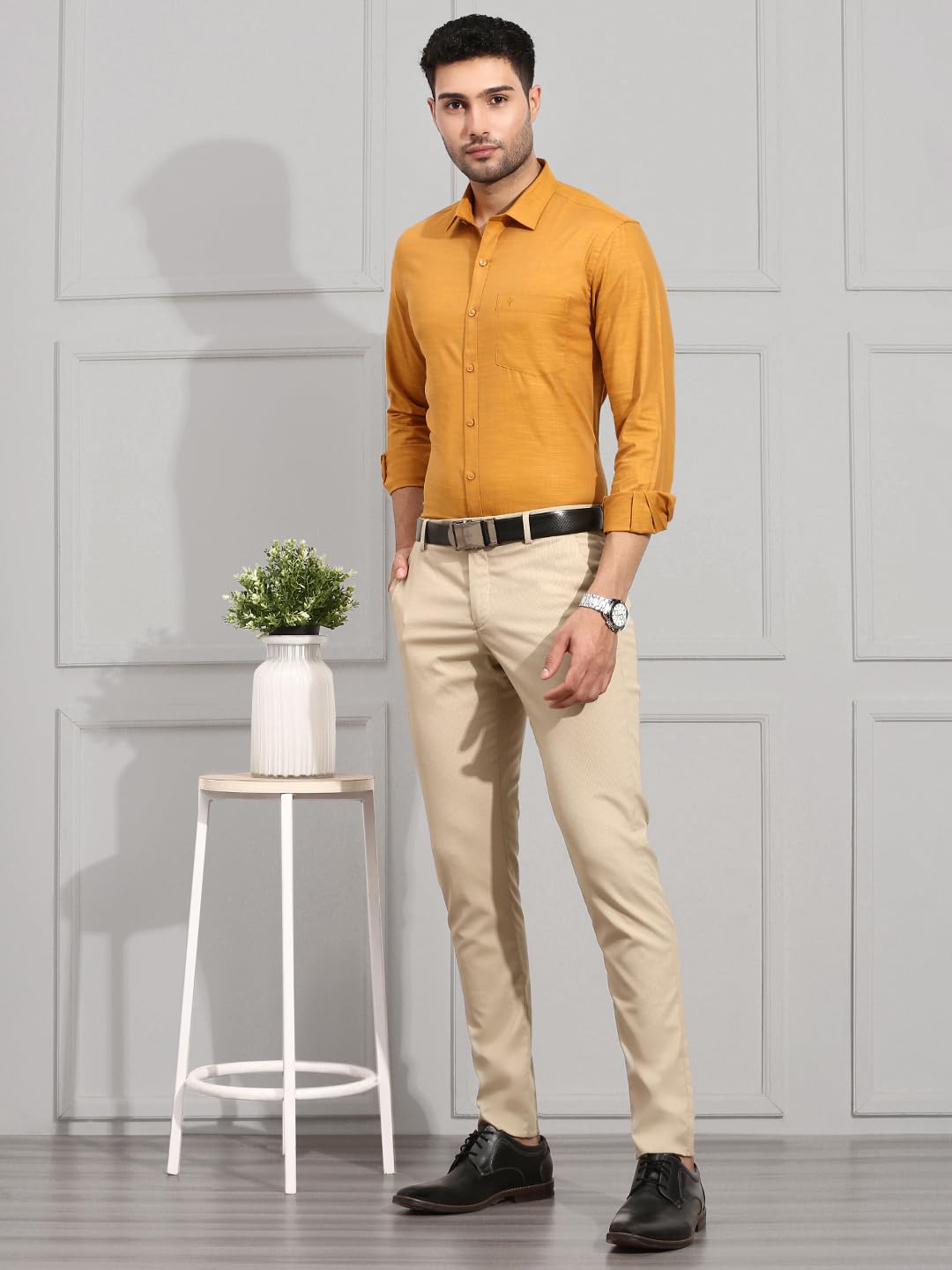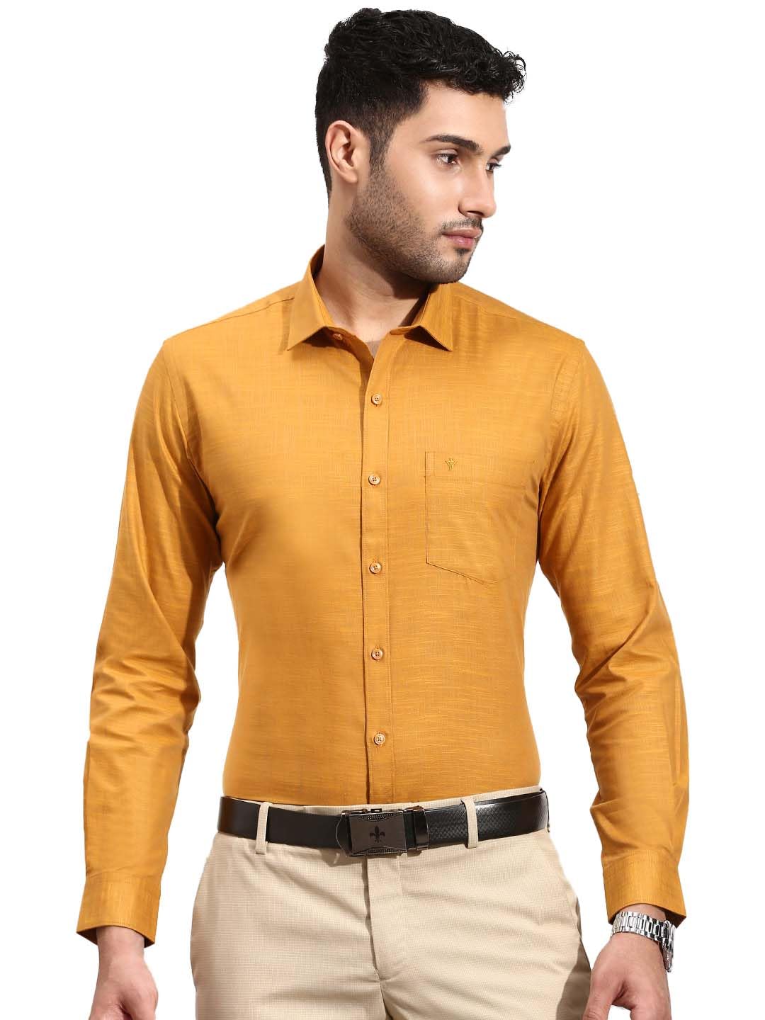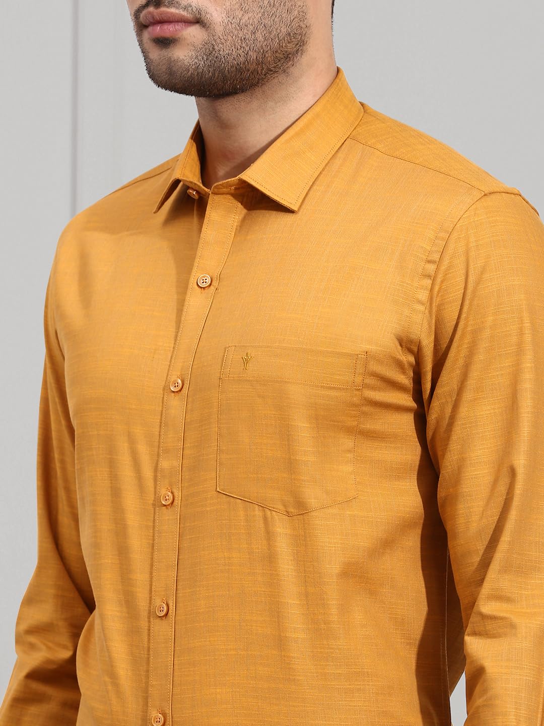 - Product features – Solid Mustard shirt with regular collar Full Sleeve and brand logo embroidered patch pocket at chest