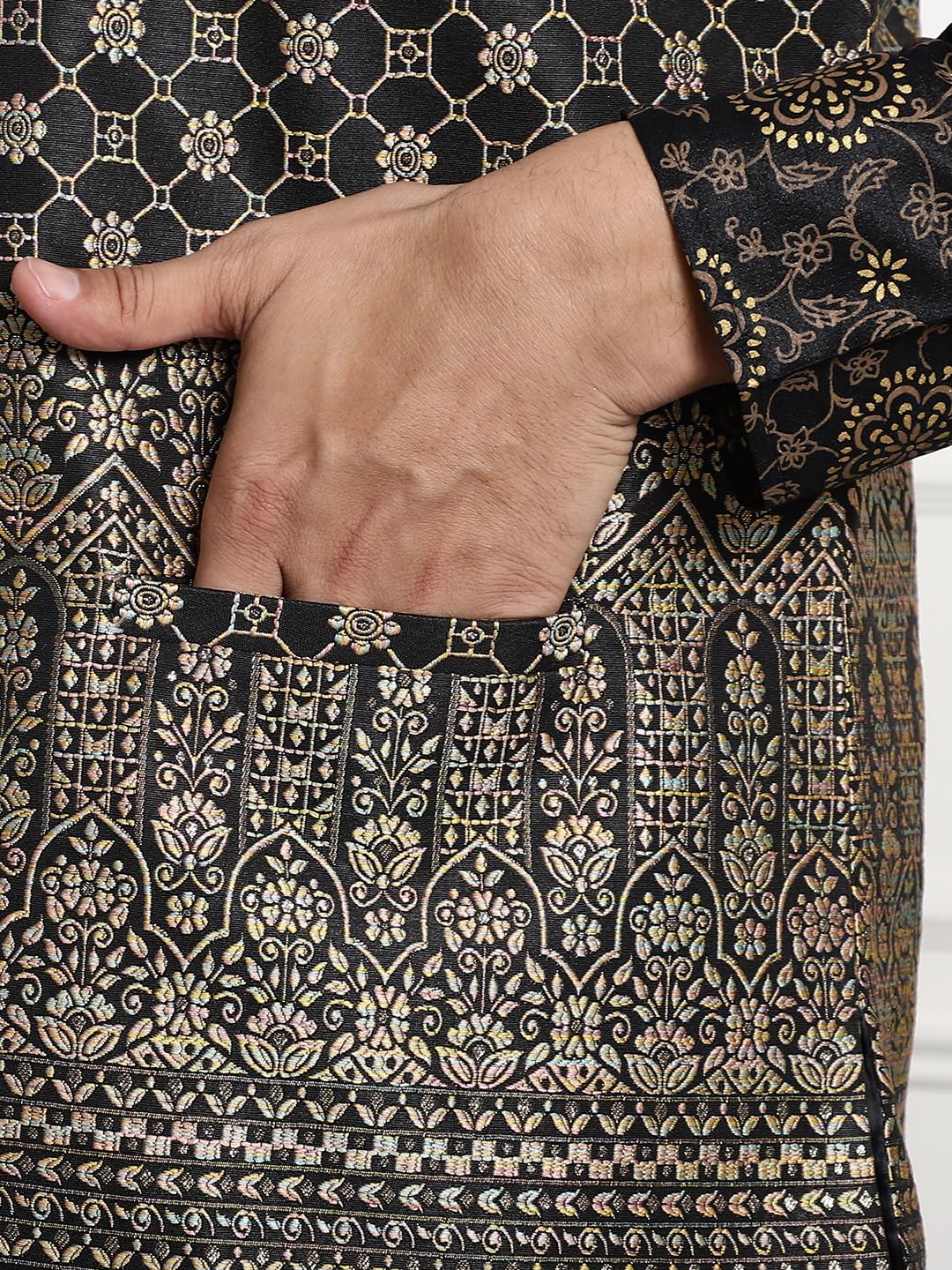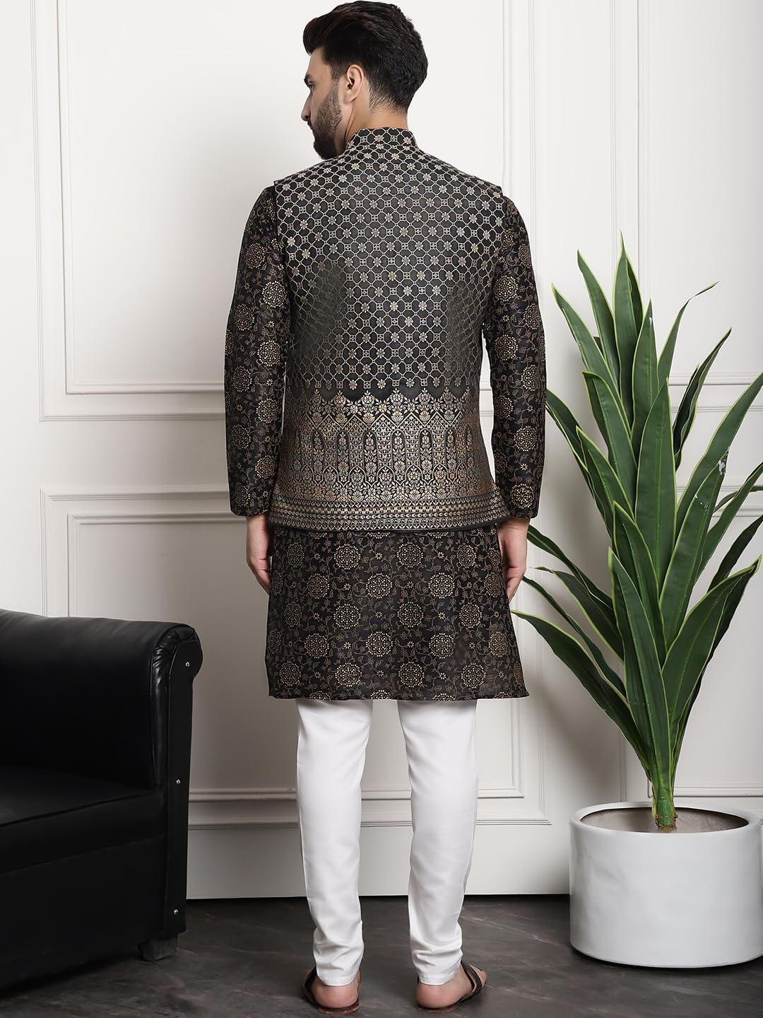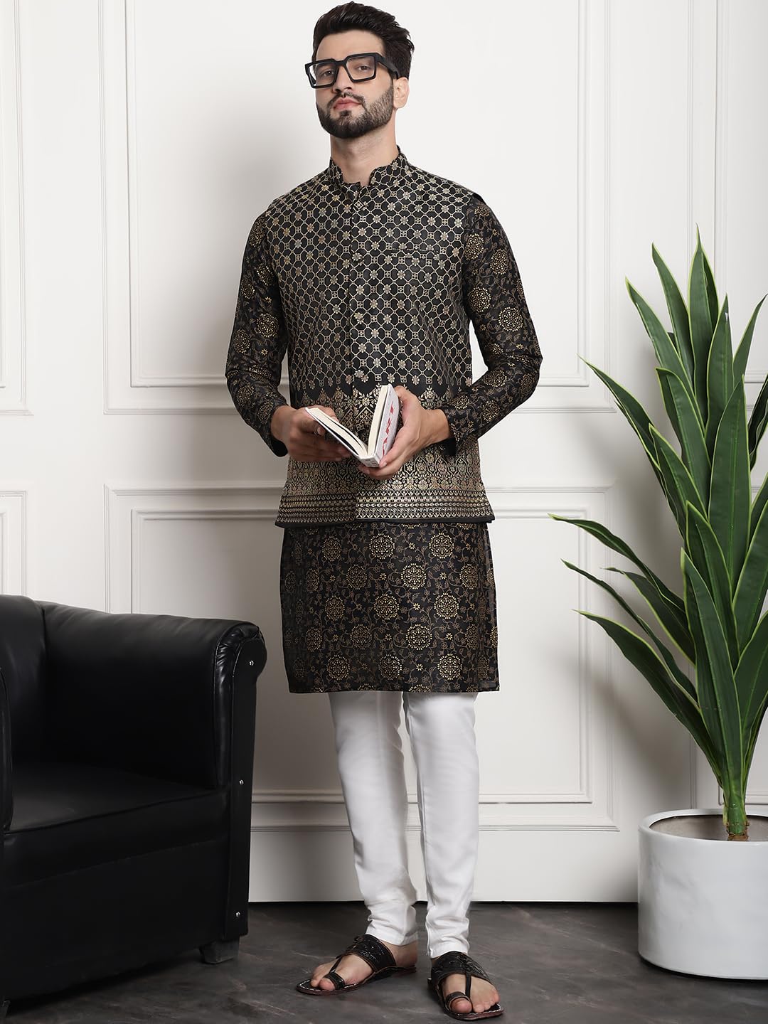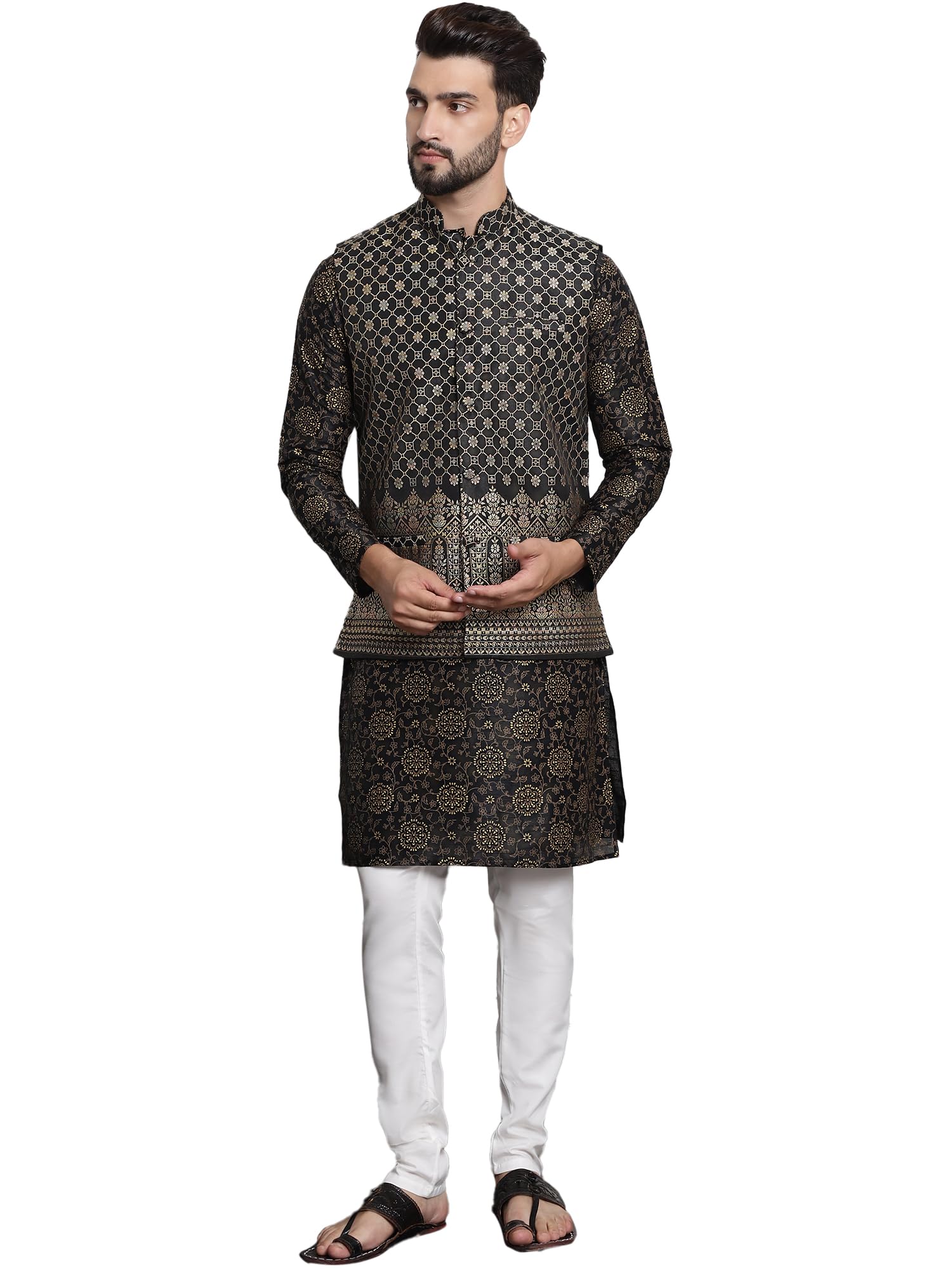 SOJANYA (Since 1958 Men’s Silk Blend Print PBlue Kurta and Cream Pyjama With Cream Nehru Jacket
