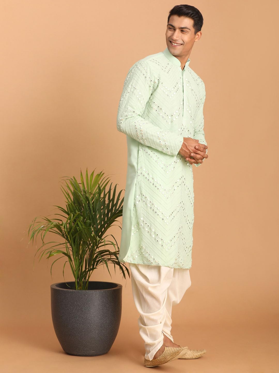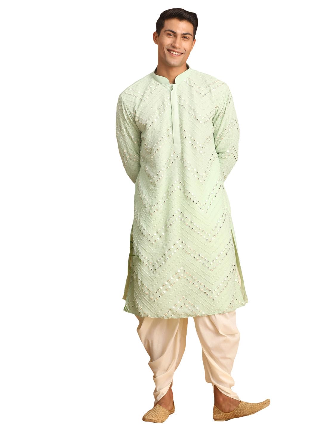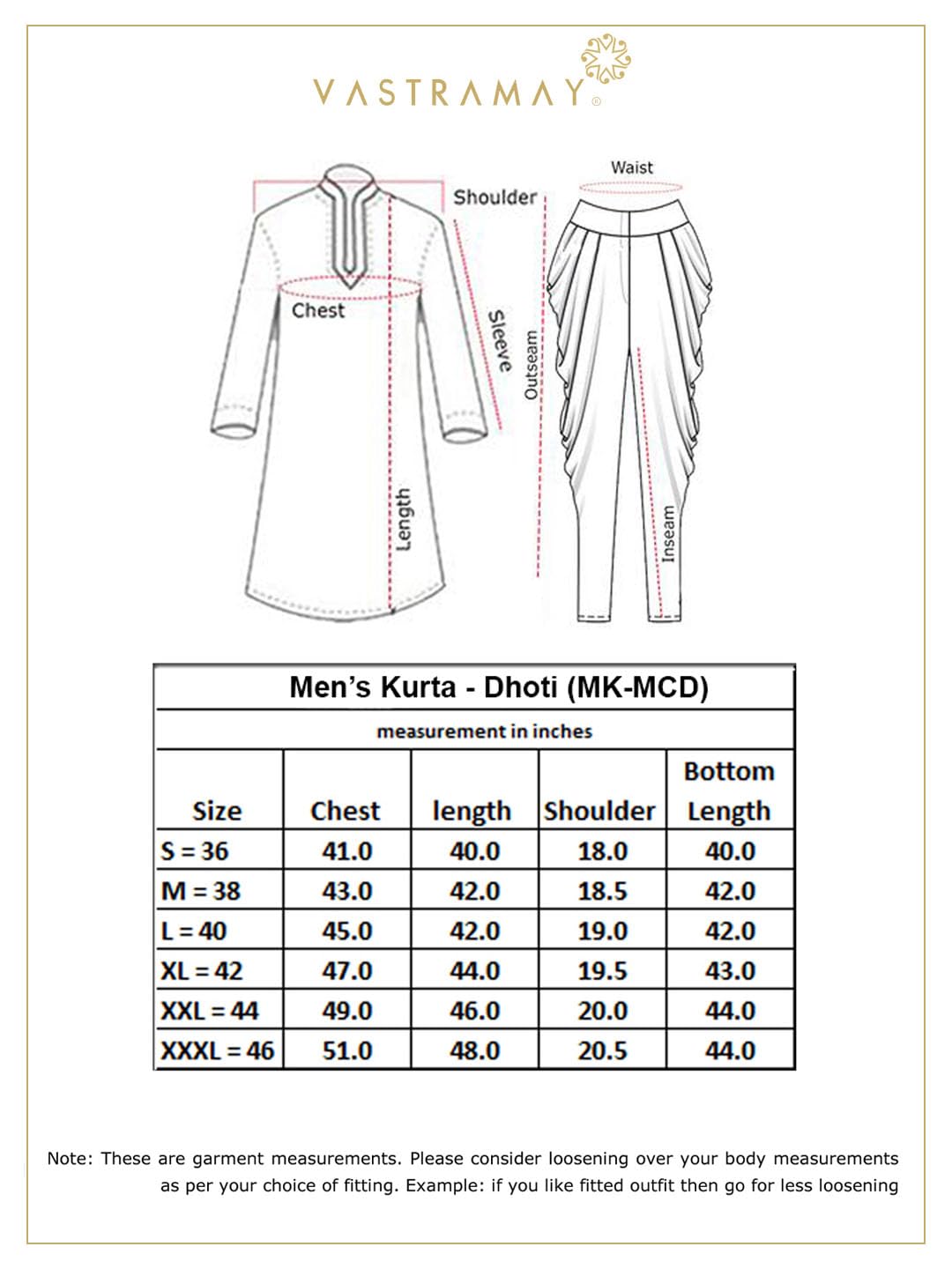 Fabric: Georgette | Contents: a Mirror work Georgette Kurta With Dhoti PantMirror work Georgette Kurta With Dhoti PantMedium length and Regular Fit. Our Kurta fitting is usually slightly relaxed compared to a Regular Shirt’s fitting. Select your Kurta size based on your chest dimension. Note: if one has a heavier abdomen compared to chest then he should select one size bigger kurta. Our Churidar Pajamas have drawstrings and a separate pocket attached to it. The pyjama bottom mohri is usually kept narror to bring out the best possible churi look. Although popularly known as Kurta Pyjama but this ethnic wear for men can be suitably used as pathani suit for men stylish, jubba for men, panjabi for men or khan dress for men stylish. Most material used for kurta under 300 tensil count only. These are good alternative to a Indo western or a sherwani. Check out for kurta for mens new looks, kurta for mens wedding, punjabi kurta for men.All our kurtas have five inches loosening over the body measurement. So if your chest round measurement is 38 inches then you should go for a 38 (Medium) size Kurta which will have a garment ready chest measurement of 43 inches. We offer six sizes – Small = 36 (Chest – 41), Medium = 38 (Chest – 43), Large = 40 (Chest – 45), X- Large = 42 (Chest – 47), XX – Large = 44 (Chest – 49) and XXX – Large = 46 (Chest – 51). Suitable for: Party, Weddings, Regular Wear, Celebrations, Occasions, Festivals, Lohri, Pongal, Makar Sakranti, Baisakhi, Holi, Eid, Raksha Bandhan, Dussehra, Diwali, Navratri, Pooja, Christmas, Onam, Ganesh Chaturthi, Janmasthmi and Gifts for Mens.Wash Care Instructions: Dry Clean preferably or cold light wash.Disclaimer: We have made a consistent effort to make the colors and finishes similar to the image of the products you see on screen. However, the actual product and the images on the website can differ! Customer’s discretion is advised.